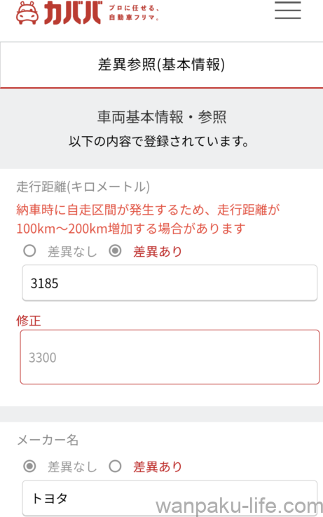 出品者は出品時(掲載写真を撮った時)と現時点で車両に差異があるかどうかを入力。
