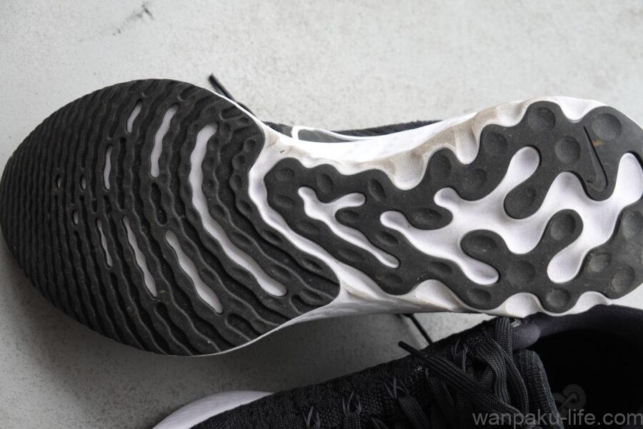 まずやっぱり特徴的なのは分厚いミッドソール部分。これがリアクト素材?とかで衝撃を吸収してくれていそう。